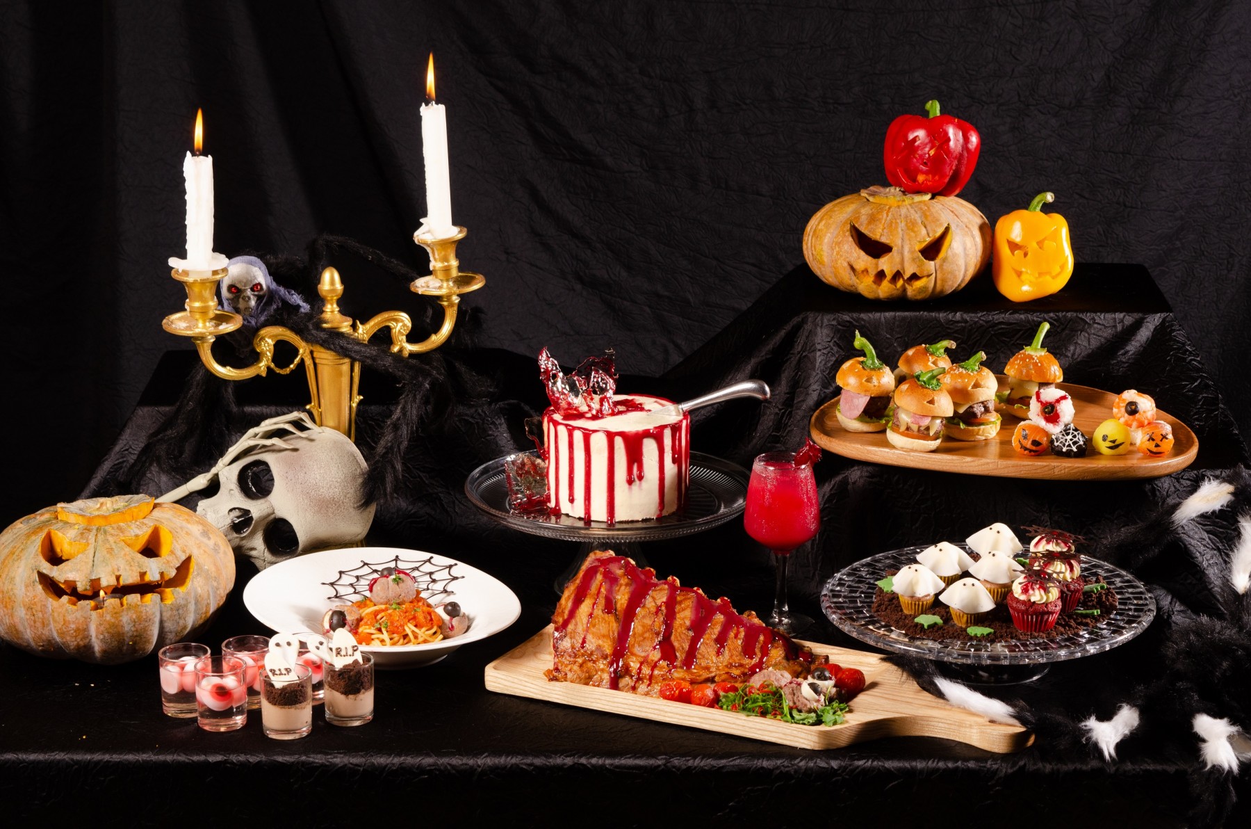 Get lost in the ghost town and enchanted-themed food stations. Enjoy unlimited fresh seafood on ice – mussels, oysters, sashimi, sushi, or flavorful grilled scallops, snails, and fish. Sink your teeth into delicious meats such as juicy beef tenderloin or tasteful roasted rack of rib and pork leg. Then, have a sip of Monkey brain or Red Spooky and heat up the Halloween spirit.