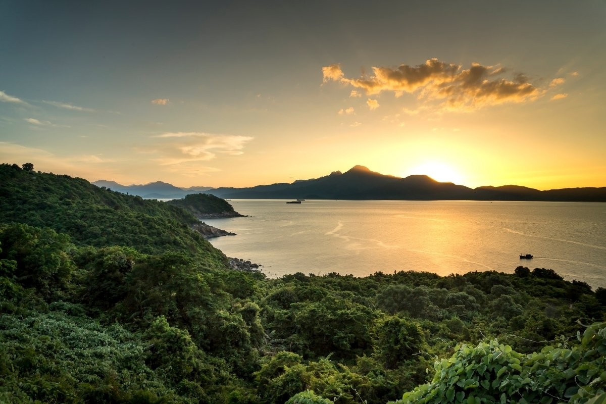 Khi ánh chiều tà buông xuống, những sợi nắng cuối ngày dần chuyển sang sắc hồng tím, phủ lên mặt biển và những sườn núi một vẻ đẹp mềm mại, lãng mạn.