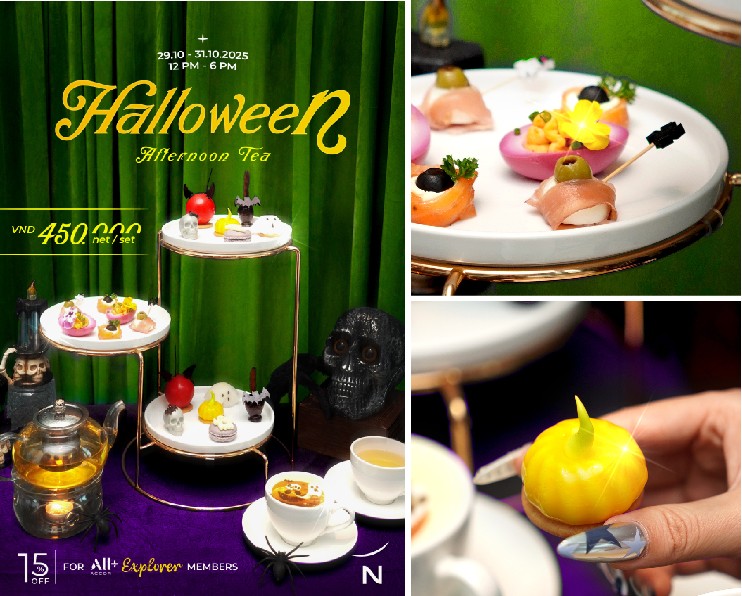 Chào đón Lễ hội Halloween với tiệc Trà chiều ma mị và ngọt ngào. Cùng nhâm nhi tách trà thơm, thưởng thức những chiếc bánh ngọt được tạo hình xinh xắn, và cảm nhận khoảnh khắc thư giãn trọn vẹn bên những câu chuyện thân quen cùng hội bạn thân và gia đình.
