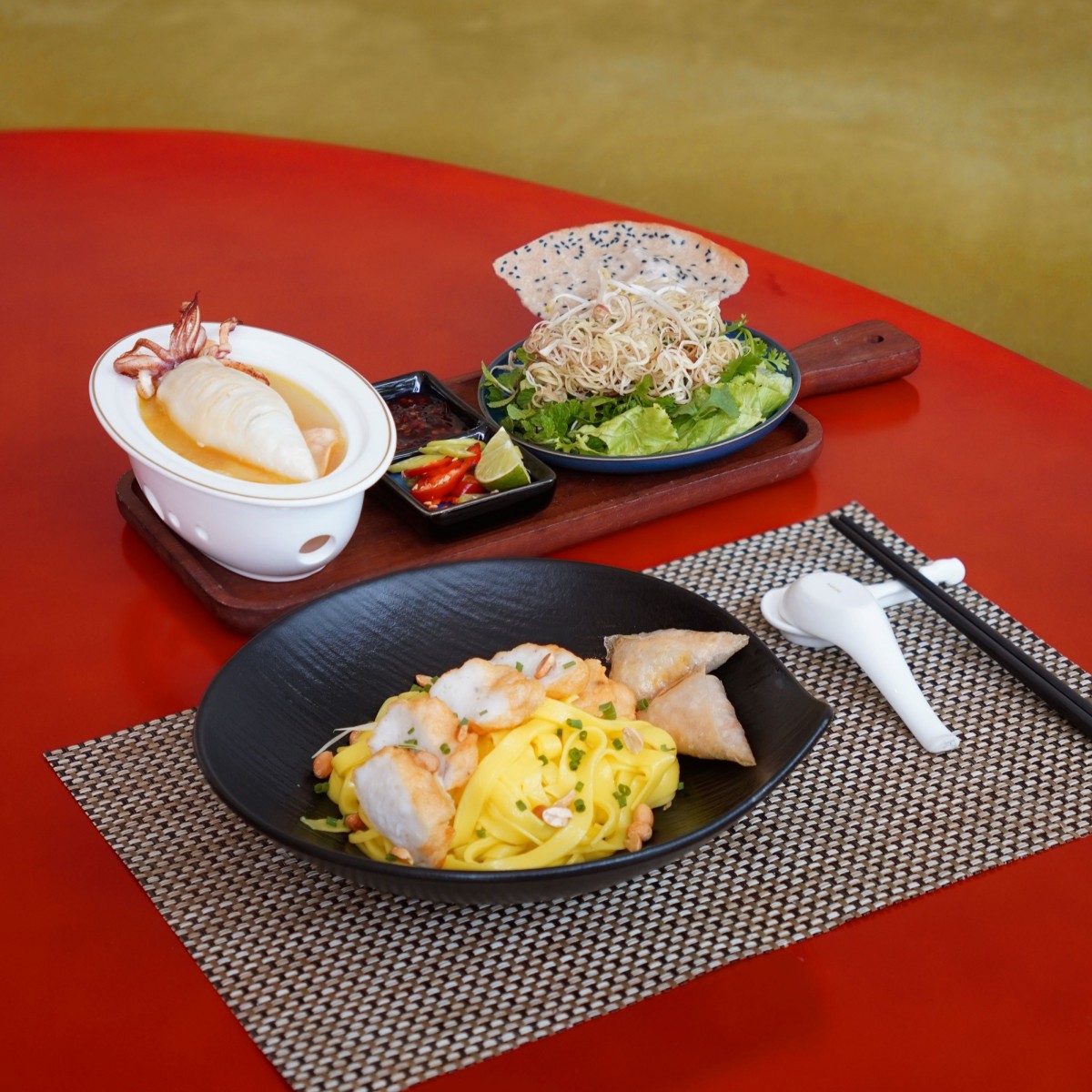 Lấy cảm hứng từ tinh hoa ẩm thực đó, Novotel Danang Premier Han River mang đến một phiên bản đặc biệt của món Mì Quảng truyền thống, được làm mới đầy tinh tế với điểm nhấn từ topping làm từ mực tươi, gợi mở một trải nghiệm ẩm thực vừa thân quen, vừa mới mẻ. Sợi mì vàng óng hòa quyện với nước dùng được ninh đậm vị, dùng kèm các loại rau thơm và đậu phộng rang bùi bùi, tạo nên sự cân bằng hài hòa và trọn vị.