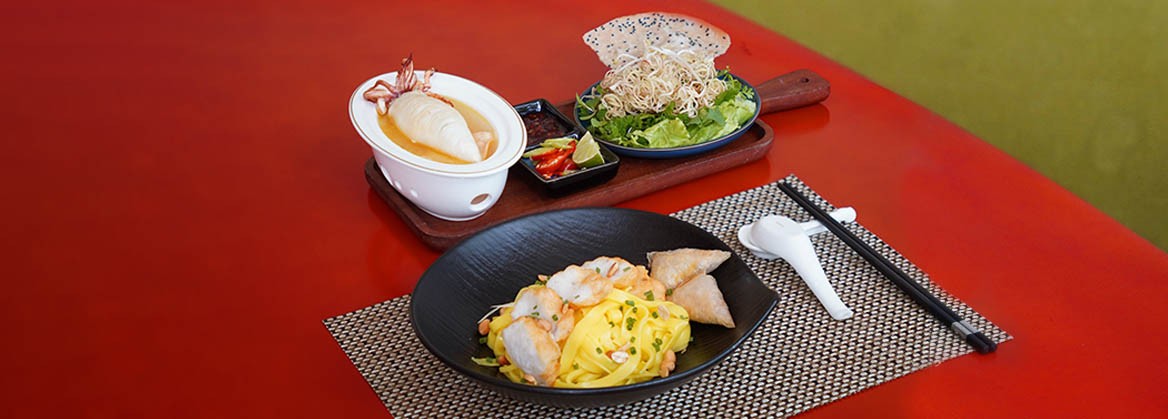 Lấy cảm hứng từ tinh hoa ẩm thực đó, Novotel Danang Premier Han River mang đến một phiên bản đặc biệt của món Mì Quảng truyền thống, được làm mới đầy tinh tế với điểm nhấn từ topping làm từ mực tươi, gợi mở một trải nghiệm ẩm thực vừa thân quen, vừa mới mẻ. Sợi mì vàng óng hòa quyện với nước dùng được ninh đậm vị, dùng kèm các loại rau thơm và đậu phộng rang bùi bùi, tạo nên sự cân bằng hài hòa và trọn vị.